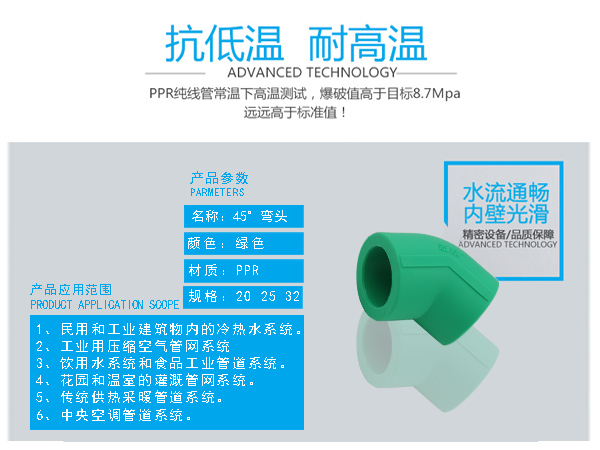 □  管件連接牢固:由于聚丙烯具有良好的熱熔接性能,熱熔連接將同種材料制造的管材和管件連接成為一個(gè)整體,杜絕了漏水的隱患。