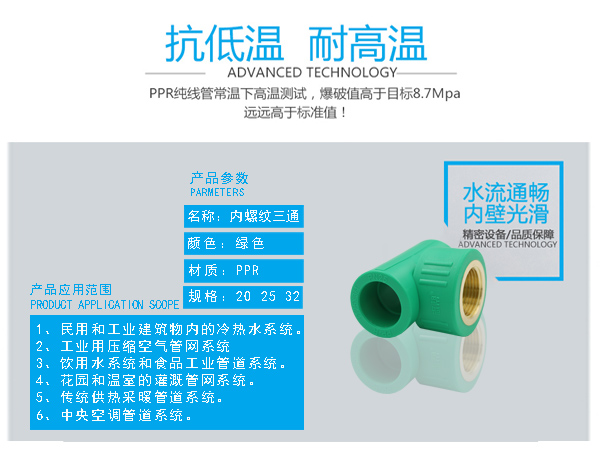 □  管件連接牢固:由于聚丙烯具有良好的熱熔接性能,熱熔連接將同種材料制造的管材和管件連接成為一個整體,杜絕了漏水的隱患。