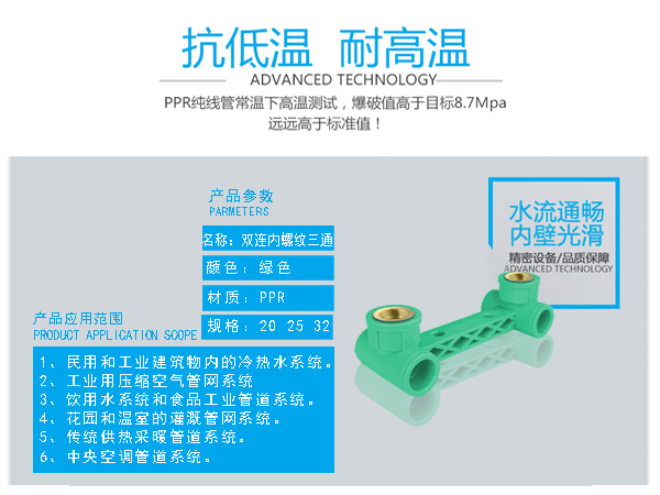 □ 配套齊全:PPR管道系統(tǒng)配套齊全,可以解決室內(nèi)和小區(qū)給水管道的工程配套要求。