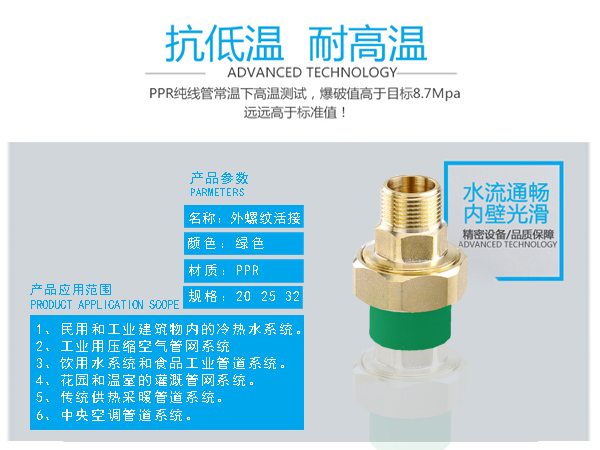 □  管件連接牢固:由于聚丙烯具有良好的熱熔接性能,熱熔連接將同種材料制造的管材和管件連接成為一個(gè)整體,杜絕了漏水的隱患。